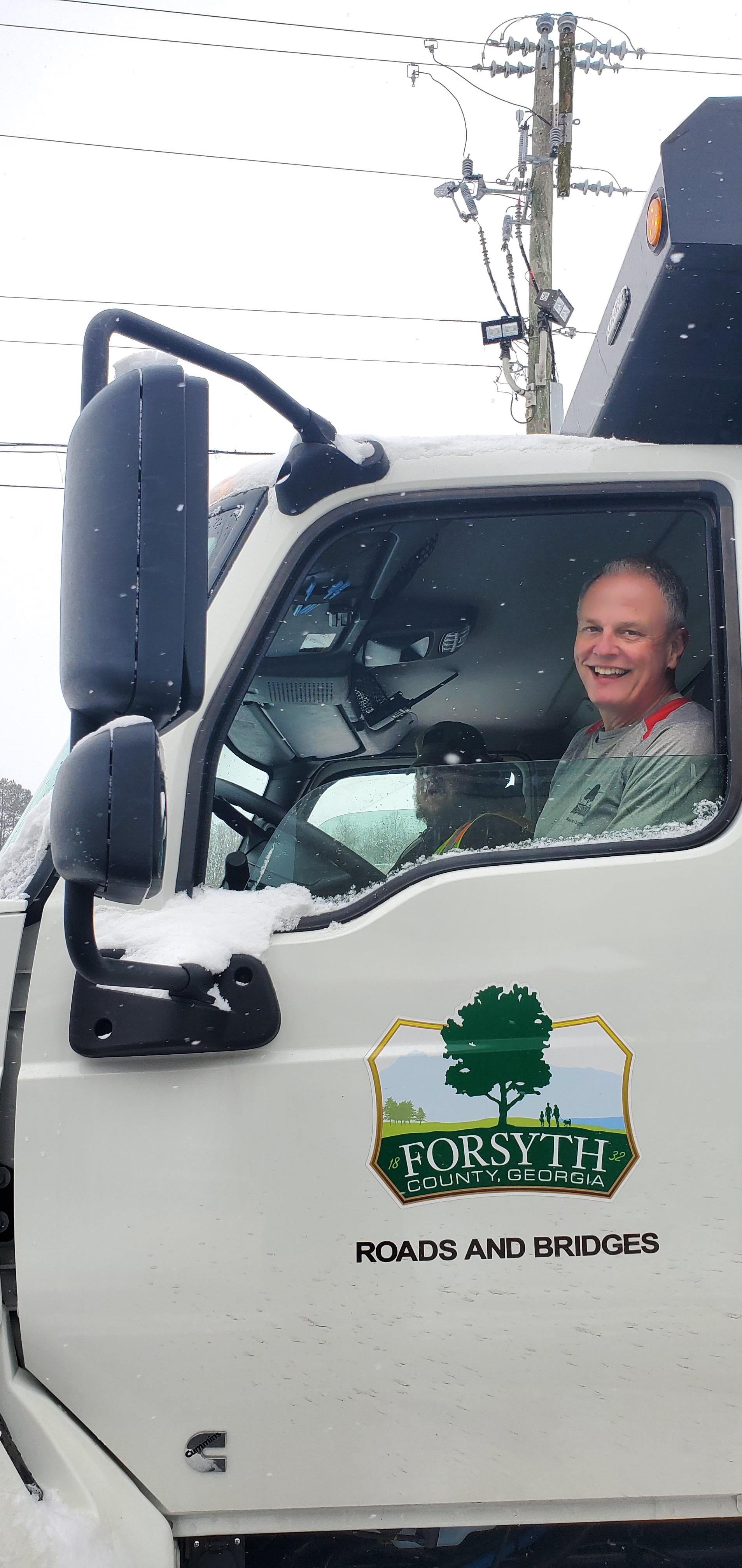 David Queen and plow operator Alex Payne from Forsyth County Roads & Bridges are covering a lot of miles today clearing over 1,200 miles of Forsyth County roads along with several other vehicles/operators! Thanks for the work! ... And we hope the heater is working in there!