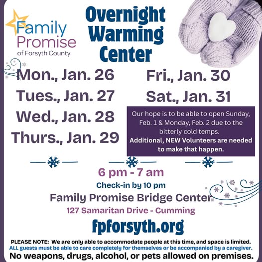 Family Promise of Forsyth, in coordination with Forsyth County public safety, plan to host an overnight warming center for residents in need overnight between 6 p.m. and 7 a.m. on Friday, Jan. 30 and Sat., Jan. 31, due to expected extreme cold temperatures. Visitors must check in at the Family Promise Bridge Center (127 Samaritan Drive) by 10 p.m.