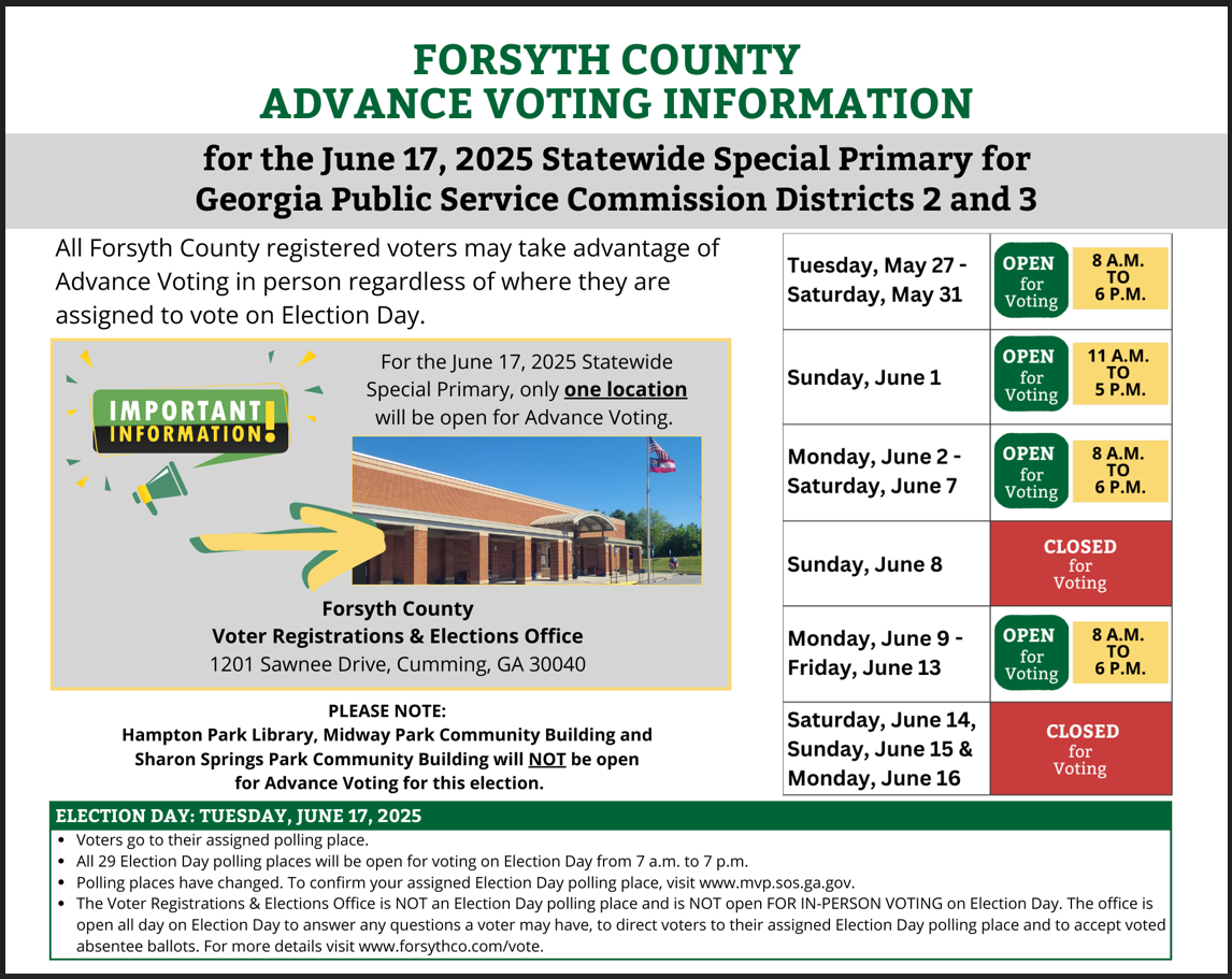 For more information regarding the June 17 Special Primary, visit the Voter Registrations & Elections Department webpage at www.forsythco.com/vote or call (770) 781-2118.