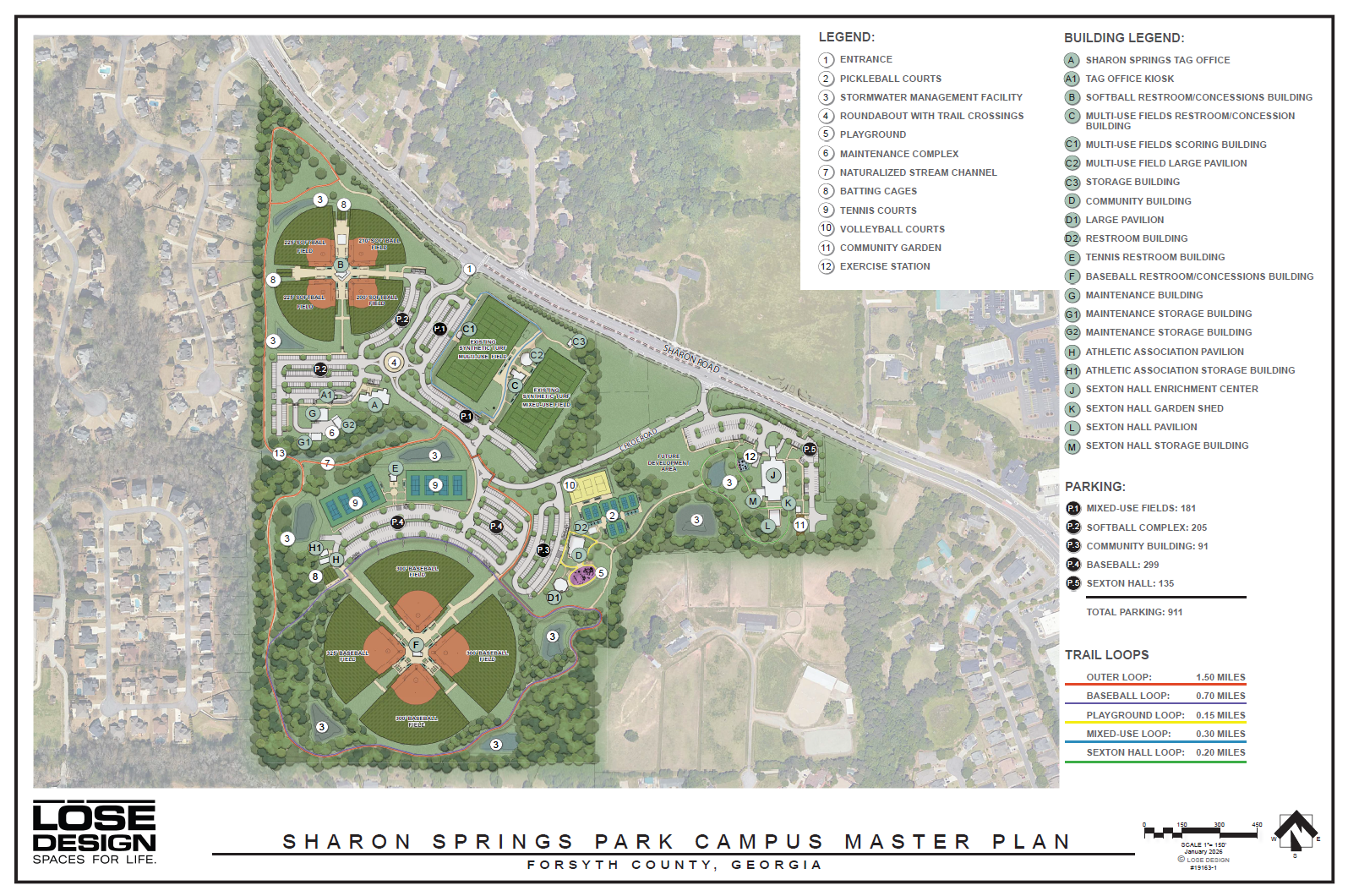 During construction, Sharon Springs Park and the Sexton Hall Community Garden will be closed to the public. The Sexton Hall Senior Services enrichment center and Forsyth County Tax Commissioner Office (1950 Sharon Road) will remain open. Sharon Springs Park is anticipated to reopen following the renovation in early 2028, weather permitting. If feasible, the renovated exterior amenities at Sexton Hall will open prior to the project’s full completion.