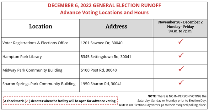 For more information regarding the Dec. 6 General Election Runoff, visit the Voter Registrations & Elections Department webpage at www.forsythco.com/vote or call (770) 781-2118.