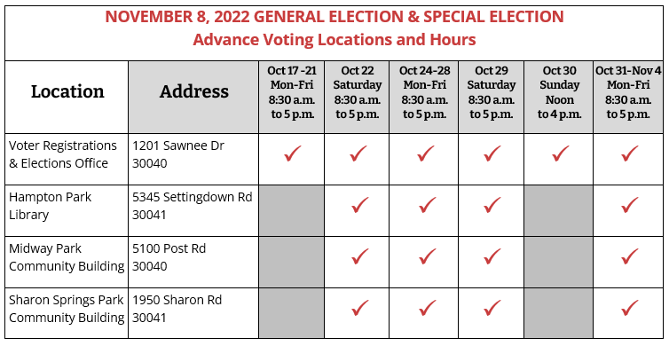 For more information regarding the Nov. 8 General Election & Special Election, visit the Voter Registrations & Elections Department webpage at www.forsythco.com/vote or call (770) 781-2118.