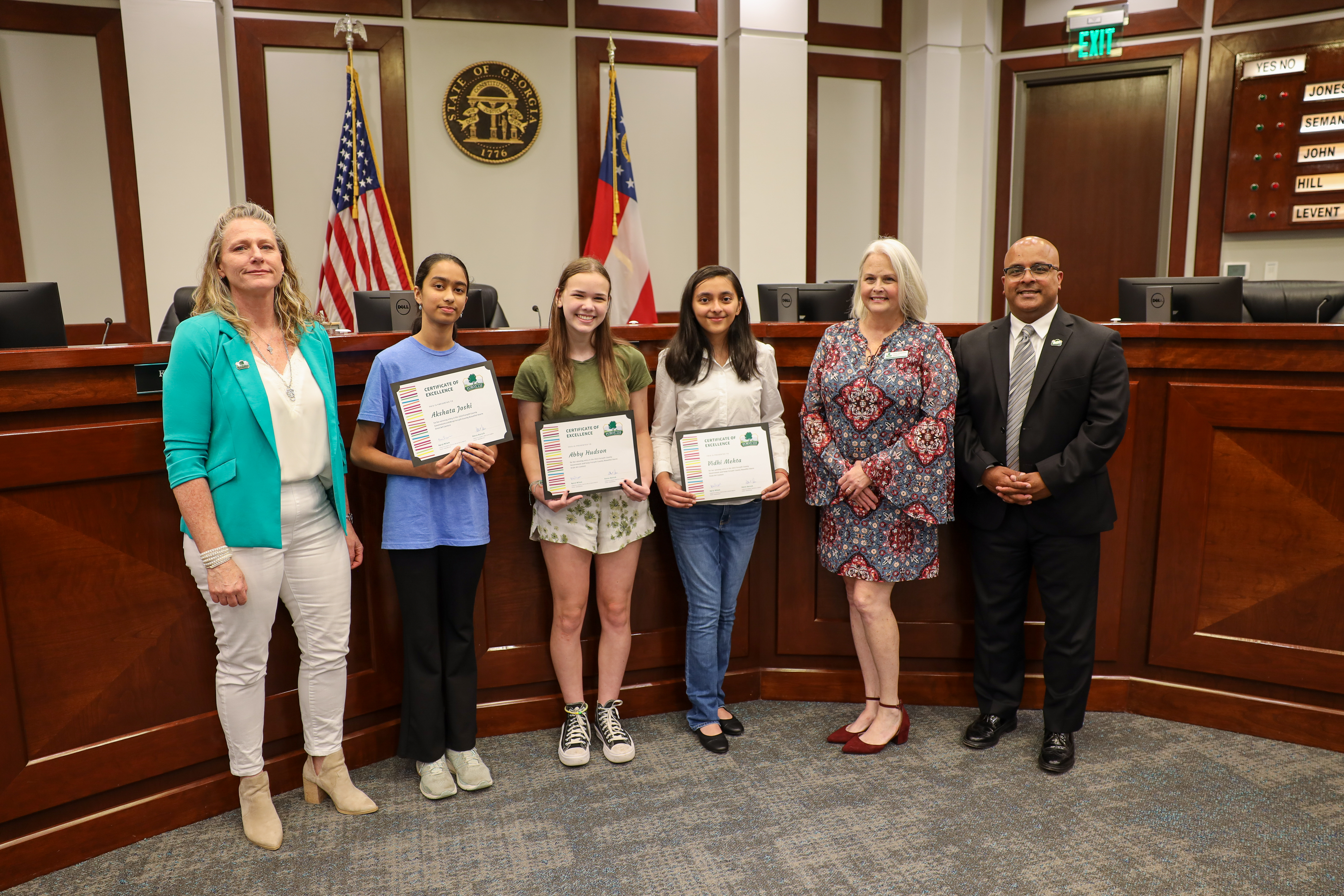 During their May 18 meeting, Forsyth County Board of Commissioners recognized three local students, Apryl Milam of the Department of Recycling & Solid Waste and Keep Forsyth County Beautiful (KFCB) for their efforts to help promote water quality and conservation.