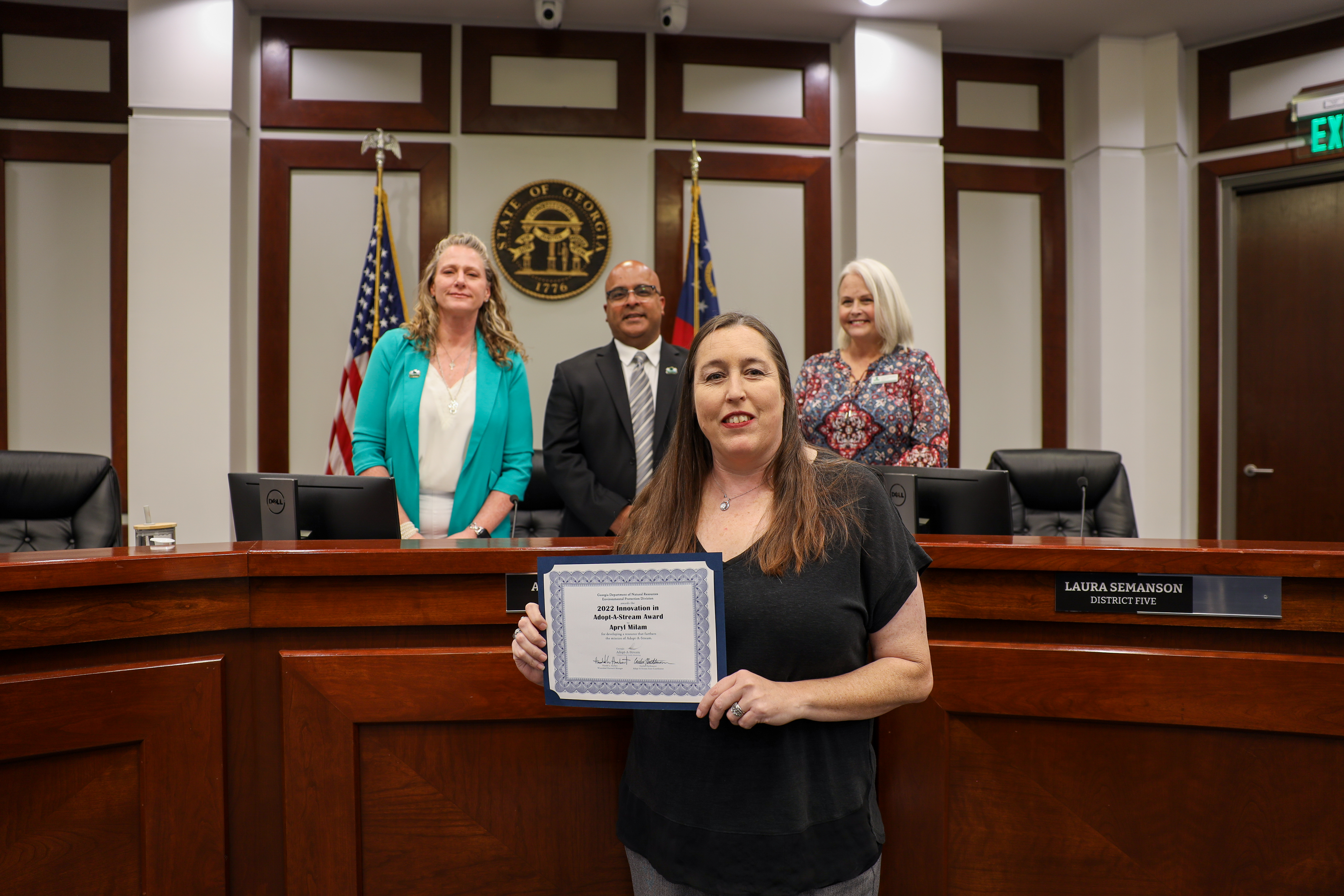 Recycling and Solid Waste employee, Apryl Milam, was recognized with an Innovation in Adopt-A-Stream award for developing a resource that furthers the mission of Adopt-A-Stream. Apryl created and implemented changes on the Chattahoochee, a multi-state, student-led, community science project that investigates and documents pollutants on the Chattahoochee River. Last fall students in four counties and two states spent their morning conducting water quality testing at various locations along the entire length of the Chattahoochee River – from Helen, Ga., to Apalachicola, Fla. To learn more about the Adopt-A-Stream program, visit KFCB’s website here.