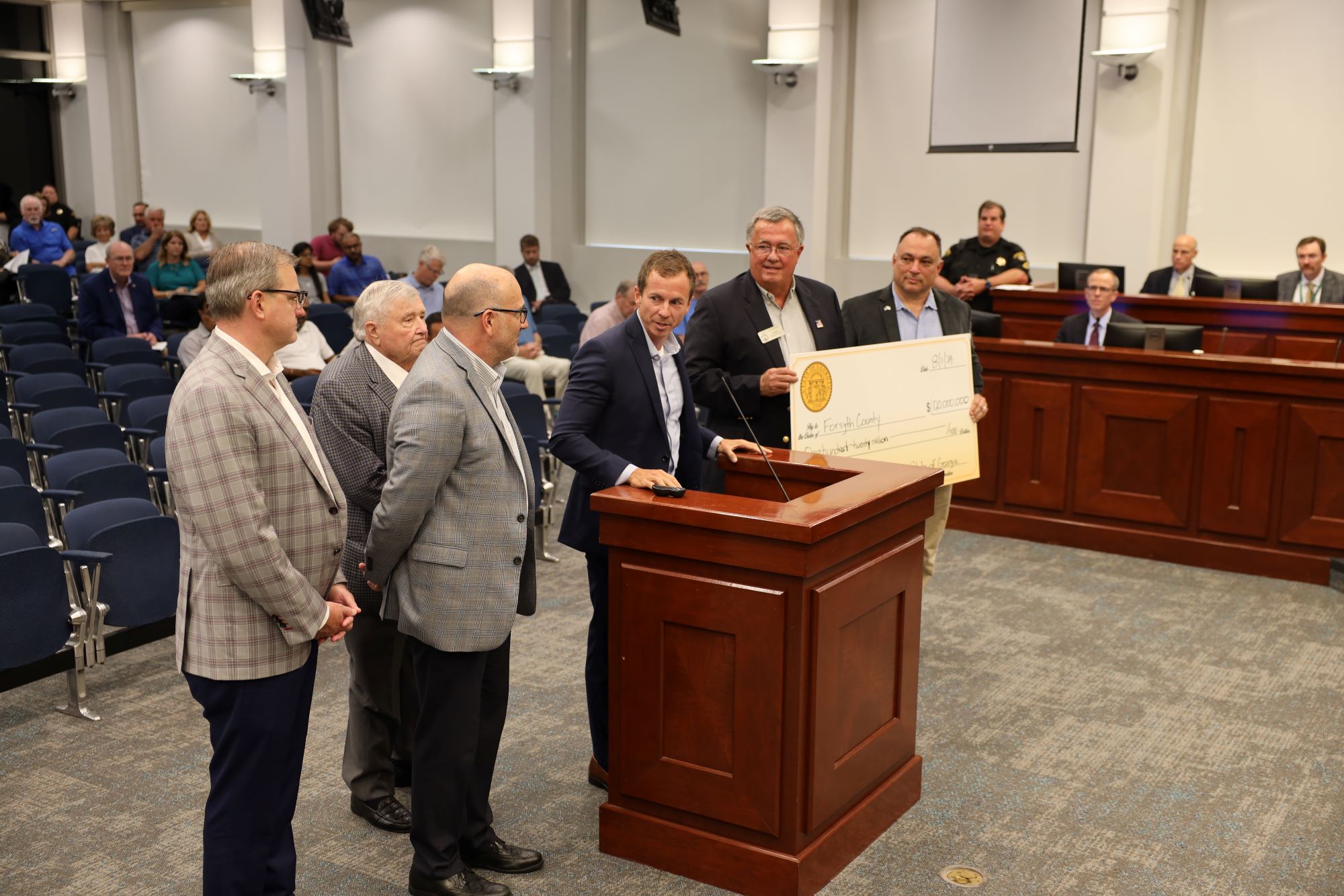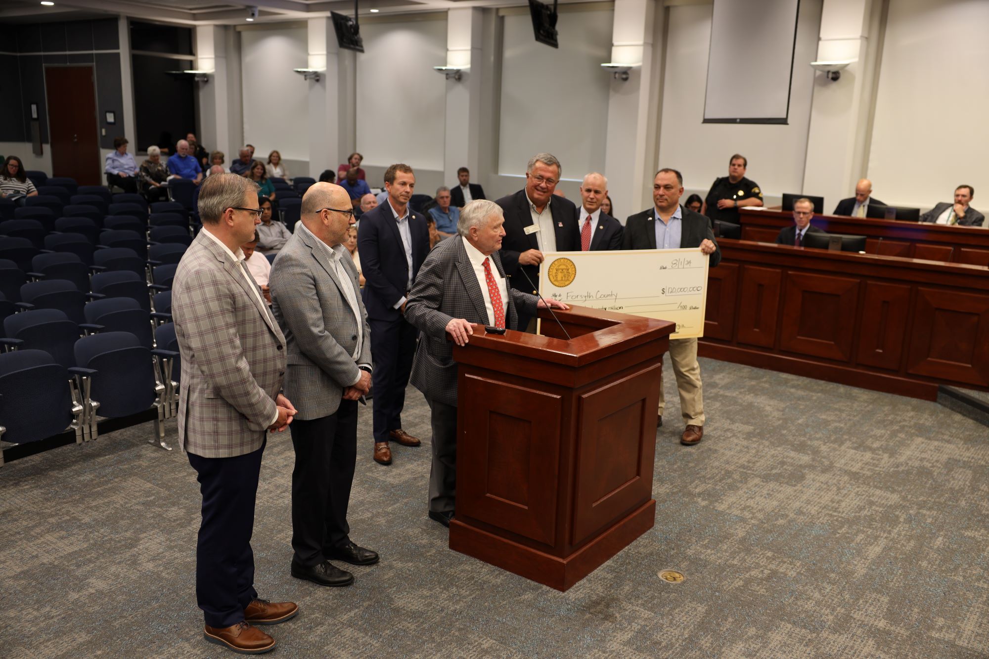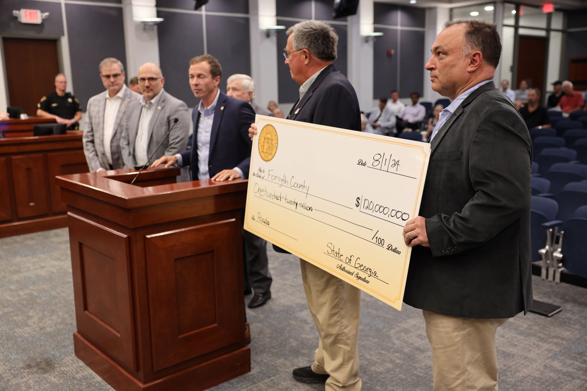 Forsyth County has received $120 million in state funds as part of a $1.5 billion infrastructure investment recently announced by Gov. Brian Kemp. Members of the County’s State delegation presented a check commemorating the investment during the Thursday, Aug. 1, Forsyth County Board of Commissioners meeting. Photos from the presentation are attached for use in your coverage, as needed.