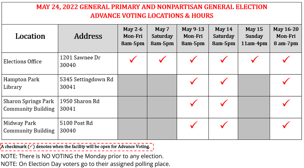 Advance Voting for the May 24 General Primary and Nonpartisan General Election began on May 2 and will be offered to registered Forsyth County voters on weekdays, two Saturdays and one Sunday over a three-week period at the following locations: