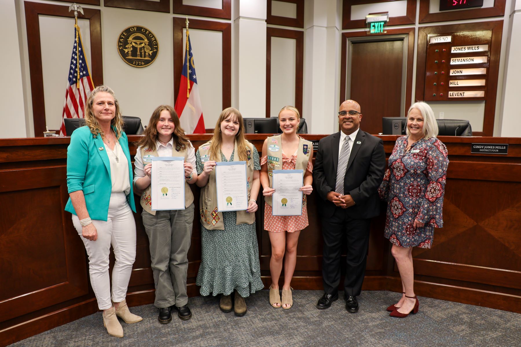 Girl Scouts honored at BOC meeting (L to R): Commissioner Kerry Hill, Laurel Ross, Clara Hamilton, Samantha Shoenfeld, Chairman Alfred John, Commissioner Laura Semanson