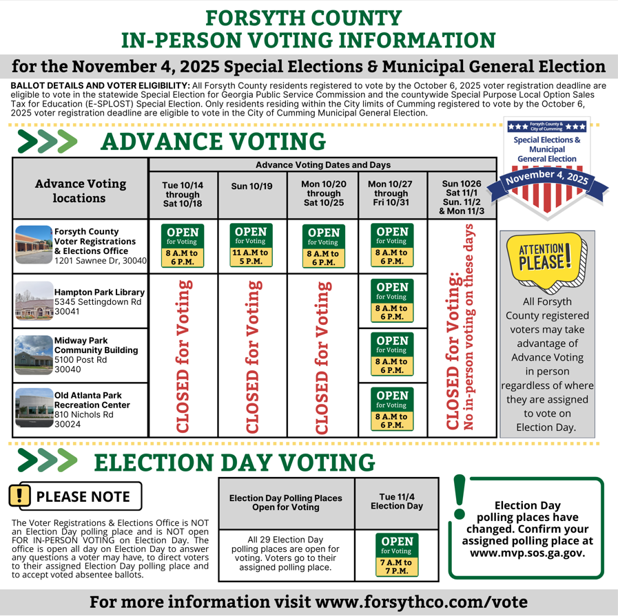 For more information regarding the Nov. 4 Special Elections & Municipal General Election, visit the Voter Registrations & Elections Department webpage at www.forsythco.com/vote or call (770) 781-2118.